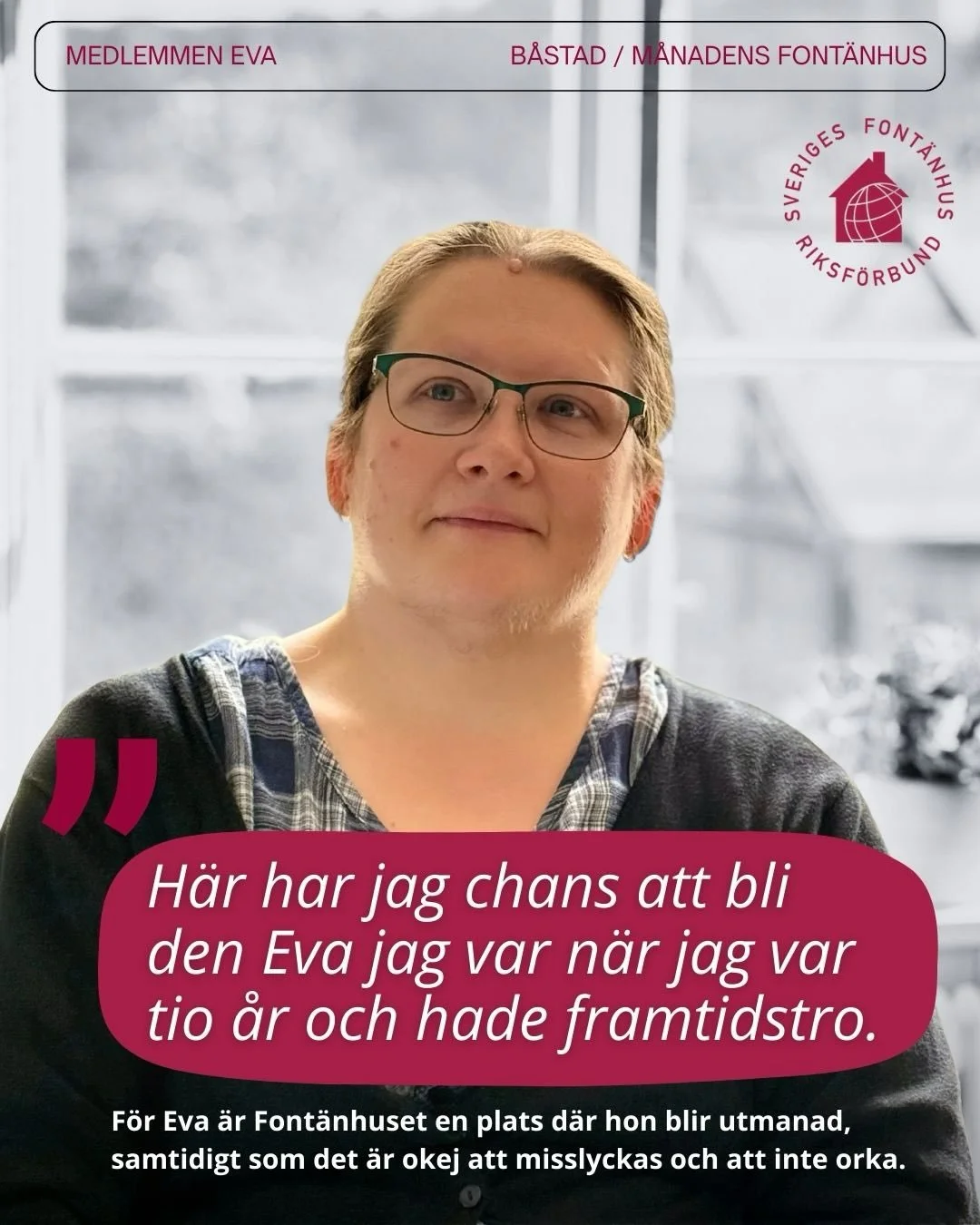 Eva kom till Fontänhuset Båstad 2013, efter en knagglig skolgång och praktikplatsplaceringar som inte fungerat. Hon beskriver en social situation där hon blivit mobbad hela vägen från grundskolan tills hon kom till Fontänhuset. Rädslan för att bli utfryst och utskälld har varit hennes följeslagare. Tanken på att ta initiativ och ansvar har utlöst oro och ångest. På Fontänhuset känner Eva att hon blir utmanad i ansvarstagande samtidigt som det är okej att misslyckas och att inte orka.